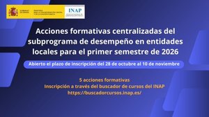 Se ha publicado la Resolución de 20 de octubre de 2025, del Instituto Nacional de Administración Pública, por la que se convocan actividades formativas centralizadas del subprograma de desempeño en entidades locales para el primer semestre de 2026.