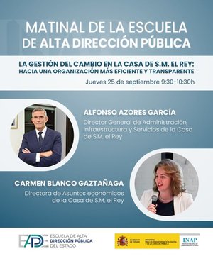 En esta ocasión se contará con la presencia de Alfonso Azores García y Carmen Blanco Gaztañaga, de la Casa Real, que hablarán sobre “la gestión del cambio en la Casa de S.M. el Rey: hacia una organización más eficiente y transparente”.