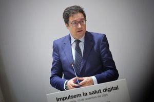 Óscar López, ministro para la Transformación Digital y de la Función Pública, firma con el president de la Generalitat de Catalunya, Salvador Illa, el primero de los convenios del programa de Servicios Digitales Inteligentes en el Sistema Nacional de Salud.