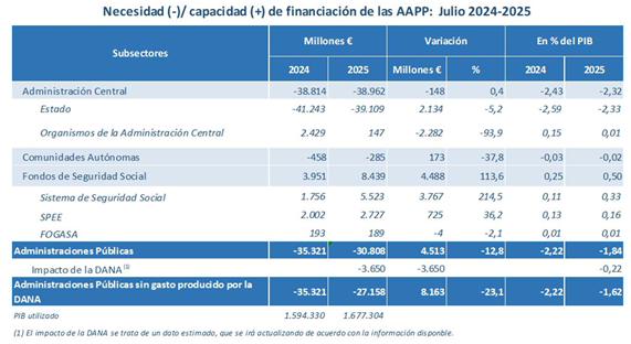 En el primer semestre de 2025, el déficit conjunto de la Administración Central, los Fondos de la Seguridad Social y las Comunidades Autónomas se sitúa en 30.808 millones, equivalente al 1,84% del PIB. Si se descuenta el impacto producido por la DANA, que alcanza los 3.650 millones, el déficit se sitúa en los 27.158 millones de euros. Es decir, sin tener en cuenta este impacto el déficit se reduce un 23,1% hasta el 1,62% del PIB.