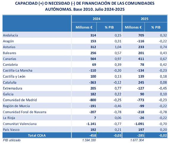 La Administración Regional registra un déficit a finales de julio de 2025 de 285 millones, lo que equivale al 0,02% del PIB, inferior en un 37,8% al déficit de 458 alcanzado en el mismo periodo del año anterior.