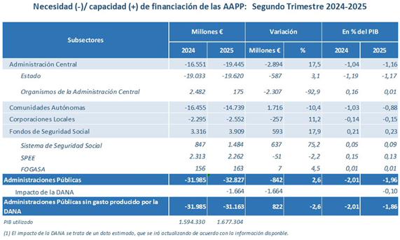 A su vez, también se han publicado los datos de ejecución presupuestaria del conjunto de Administraciones Públicas del segundo trimestre, que incluyen los datos correspondientes a las Corporaciones Locales. En los seis primeros meses de 2025 el déficit del conjunto de las Administraciones Públicas alcanza los 32.827 millones de euros. Si se descuenta el efecto de la DANA, este se situaría en 31.163 millones, inferior en un 2,6% al del mismo periodo de 2024.