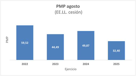 Por otro lado, si el PMP de agosto de 2025 se comparase con el del mes anterior se observaría que aumenta 3,67 días, si bien este resultado pierde representatividad al tratarse de una magnitud con estacionalidad.