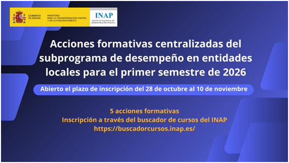 Se ha publicado la Resolución de 20 de octubre de 2025, del Instituto Nacional de Administración Pública, por la que se convocan actividades formativas centralizadas del subprograma de desempeño en entidades locales para el primer semestre de 2026.
