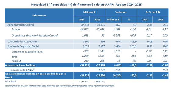 Hasta el octavo mes de 2025, el déficit conjunto de la Administración Central, los Fondos de la Seguridad Social y las Comunidades Autónomas se sitúa en 27.478 millones, equivalente al 1,64% del PIB. Si se excluye el impacto por la DANA de 3.598 millones, el déficit se sitúa en 23.880 millones de euros. Es decir, sin tener en cuenta este impacto el déficit se reduce en un 30% hasta el 1,42% del PIB.
