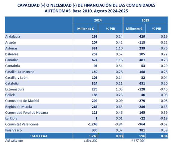 La Administración Regional registra un superávit a finales de agosto de 2025 de 596 millones de euros, lo que equivale al 0,04% del PIB.