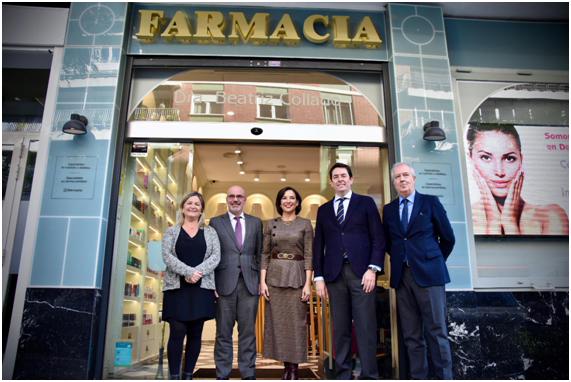 Al acto de primera dispensación han asistido Francisco Martín, delegado del gobierno en Madrid; Myriam Pallarés, directora general de MUFACE; Raquel Martínez, secretaria general del Consejo General de Colegios Oficiales de Farmacéuticos (CGCOF) y Manuel Martínez, presidente del Colegio Oficial de Farmacéuticos de Madrid (COFM), que en la fotografía aparecen junto a la primera mutualista de Madrid en utilizar la e-receta y la farmacéutica que la ha atendido.