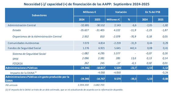 Hasta el noveno mes de 2025, el déficit conjunto de la Administración Central, los Fondos de la Seguridad Social y las Comunidades Autónomas se sitúa en 18.817 millones, equivalente al 1,12% del PIB. Si se excluye el impacto por la DANA de 4.050 millones, el déficit se sitúa en 14.767 millones de euros. Es decir, sin tener en cuenta este impacto el déficit se reduce en un 39,3% hasta el 0,88% del PIB.