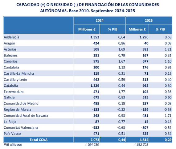 La Administración Regional registra un superávit a finales de septiembre de 2025 de 4.814 millones de euros, lo que equivale al 0,29% del PIB.