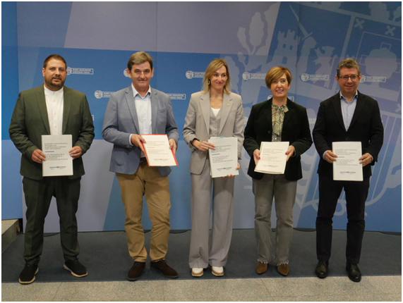 La consejera de Gobernanza, Administración Digital y Autogobierno del Gobierno Vasco, Maria Ubarretxena, junto al diputado de Igualdad, Euskera y Gobernanza de la Diputación Foral de Álava, Iñaki Gurtubai, del diputado de Administración Pública y Relaciones Institucionales de la Diputación Foral de Bizkaia, Ager Izagirre, de la diputada de Gobernanza de la Diputación Foral de Gipuzkoa, Irune Berasaluze, y el representante de Eudel, Erlantz Urresti, ha presentado hoy en rueda de prensa los avances de la Ley de Agilización y Simplificación Administrativa, que comienza ahora el proceso interno y la apertura de un proceso de participación ciudadana, reforzando así los valores de transparencia y corresponsabilidad. El desarrollo de esta norma concluirá con la aprobación en Consejo de Gobierno del anteproyecto de ley y, posteriormente, será remitido al Parlamento Vasco.