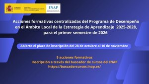 Se ha publicado la Resolución de 20 de octubre de 2025, del Instituto Nacional de Administración Pública, por la que se convocan actividades formativas centralizadas del subprograma de desempeño en entidades locales para el primer semestre de 2026.